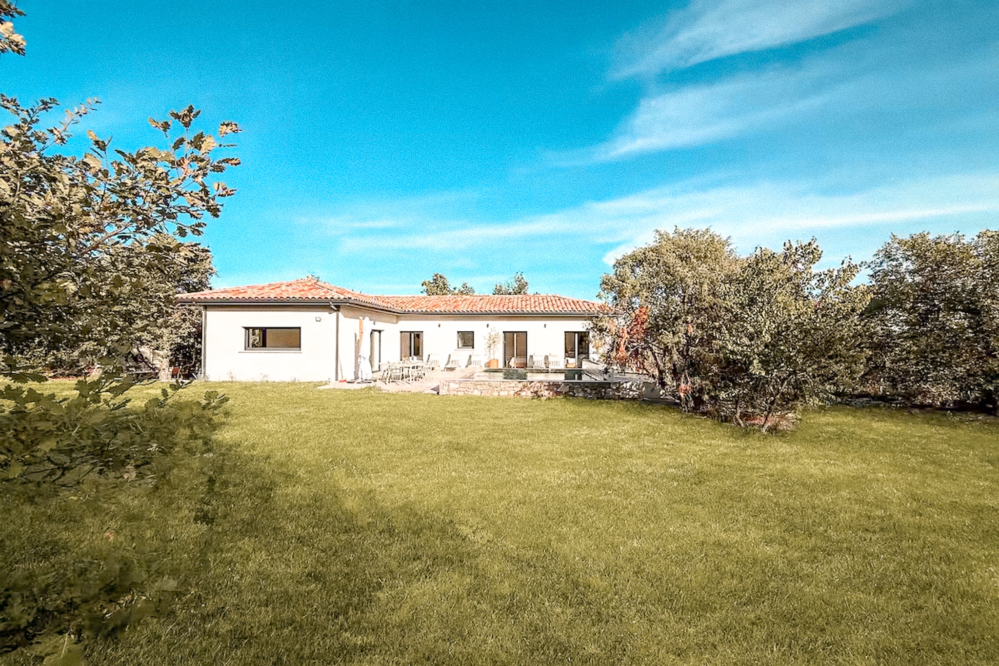 UN JARDIN DE 2000m2 AVEC TERRAIN DE PÉTANQUE, TRANSATS, TABLES SOUS LES ARBRES…